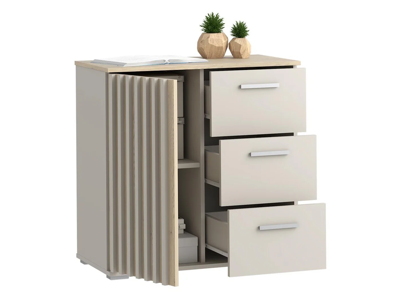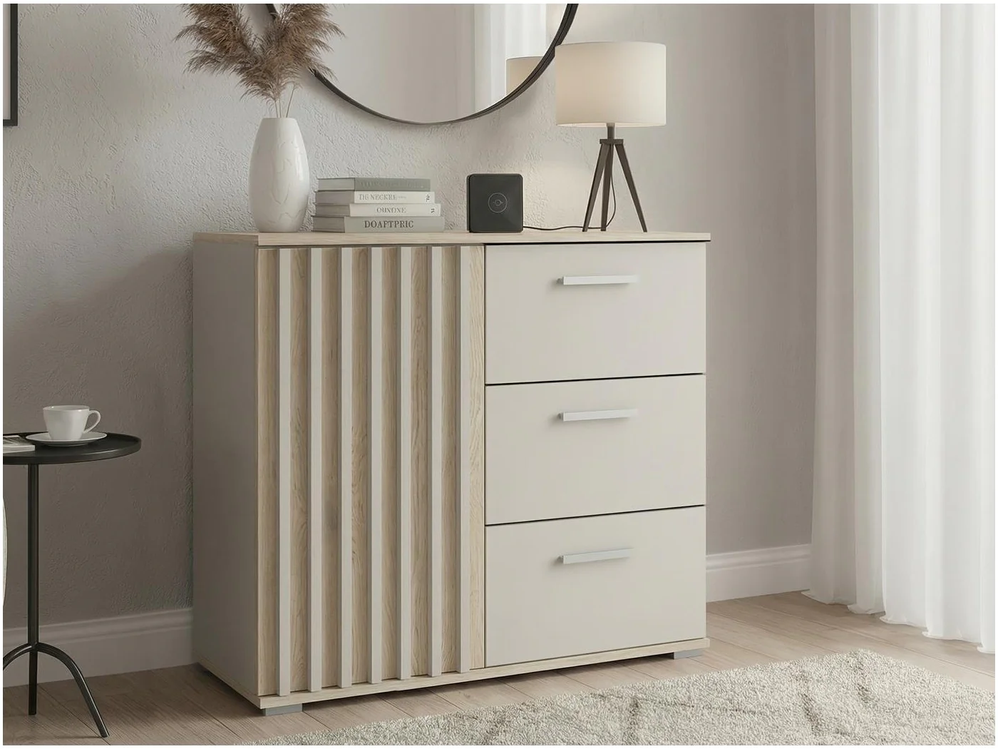 Trzy pojemne szuflady oraz zamykana szafka z półką pozwalają wygodnie przechowywać ubrania, pościel, dokumenty, akcesoria czy dekoracje, a prowadnice rolkowe z blokadą wysuwu gwarantują płynne i bezpieczne użytkowanie. Dzięki lamelom MDF o smukłym profilu i niewidocznym montażu komoda zachowuje minimalistyczny, elegancki charakter, który wpasuje się w salon, sypialnię, biuro czy przedpokój.