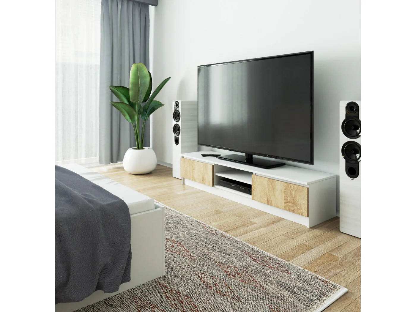 Szafka RTV 160 cm to propozycja dla właścicieli telewizorów o wielkości 55cali, 65cali bądź większych. Jest to niski mebel o wysokości 33 cm. Jego szerokość to 160 cm, a głębokość - 40 cm. Jest to mebel niezwykle elegancki, idealnie nadający się do salonu, choć nie tylko. Można go także postawić w pokoju młodzieżowym czy poczekalni. Szafka jest koloru białego, zaś fronty szuflad są barwy dębu sonoma. To połączenie kolorystyczne daje ciekawy efekt wizualny. Sprawdzi się ono nie tylko w eleganckich wnętrzach, ale również tych designerskich. Półki w komodzie gwarantują miejsce na dekodery i konsole, a uchylne drzwiczki pomieszczą inne przedmioty. Największą zaletą stolika jest możliwość skonfigurowania meblościanki, czyli doposażenia go w jedną, dwie lub więcej szafek wiszących i stworzenia świetniej zabudowy ściany.