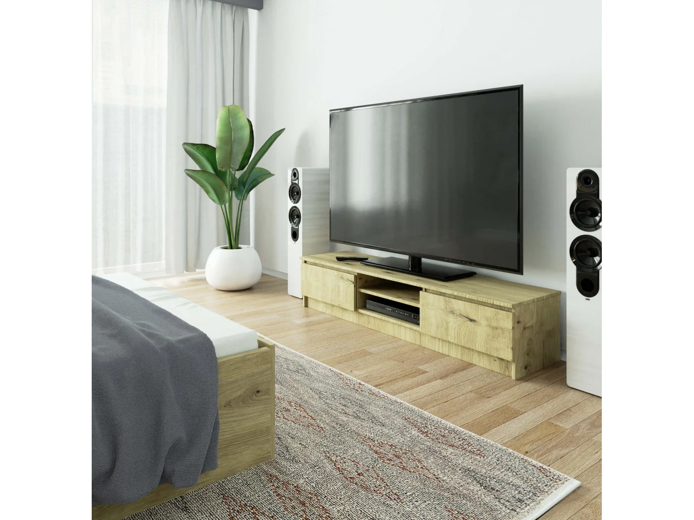 Szafka RTV dąb artisan jest uniwersalnym rozwiązaniem, które doskonale sprawdzi się nie tylko w salonie lub pokoju dziennym, ale także można ją umieścić zarówno w sypialni, jak i pokoju młodzieżowym, w którym na wyposażeniu znajduje się telewizor.