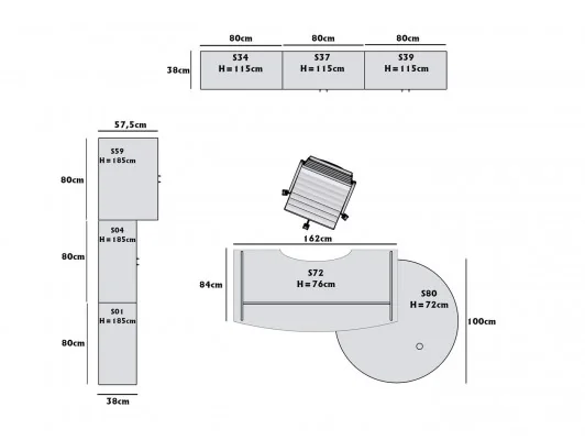 Regały S34, S37, S39 o wymiarach: 80/115/38 cm