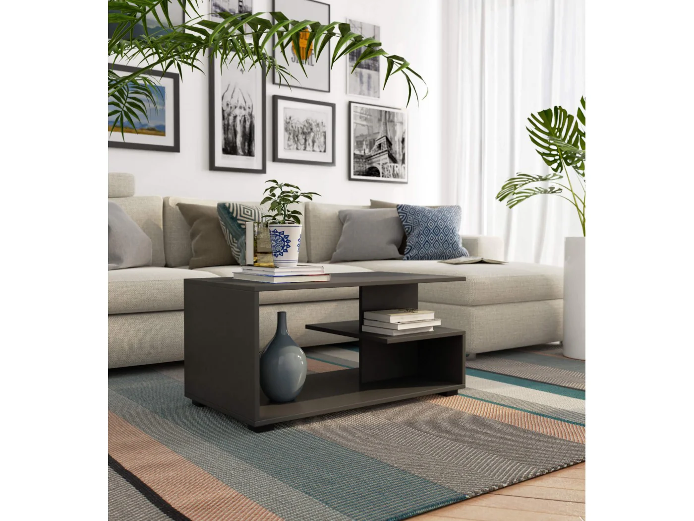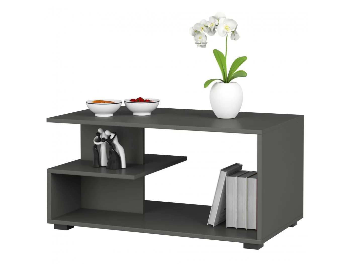 Stolik kawowy grafit szary to atrakcyjny pod względem wizualnym mebel do wielu zastosowań. Przy stoliku można nie tylko wygodnie napić się kawy i zjeść ciasto, ale także spędzać czas na czytaniu magazynów czy grać w gry planszowe. Ława do salonu może też pełnić funkcję mebla pomocniczego w pokoju dziennym, na który można w czasie przyjęcia z rodziną lub przyjaciółmi odstawić część zbędnej w danym momencie na stole zastawy. Wyróżniający się nowoczesnym designem stolik, jeśli postawimy na nim elegancki wazon, rzeźbę czy świecznik, sprawdzi się również do celów dekoracyjnych. Ława kawowa pin grafit szary jest wykonana z odpornej na zarysowania i ścieranie płyty laminowanej, a jej krawędzie zostały wykończone efektownymi i trwałymi obrzeżami ABS. Stolik kawowy 90cm posiada dwie półki, w tym jedną, w dolnej części mebla, wielkości blatu, a drugą, mniejszą, w połowie wysokości stolika. Półki mogą mieć dowolne, uzależnione od indywidualnych upodobań przeznaczenie – na książki, płyty, czasopisma czy aparat fotograficzny.