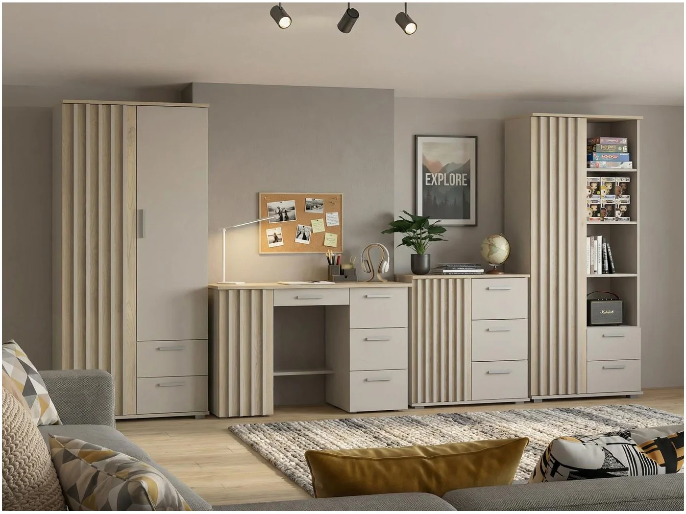 Stwórz spójny i nowoczesny pokój młodzieżowy dzięki zestawowi 4-elementowemu, który łączy elegancki wygląd z przemyślaną funkcjonalnością. Pionowe lamele na frontach dodają charakteru i nowoczesnego stylu, a każdy element został zaprojektowany tak, aby zapewnić komfortową przestrzeń do nauki, przechowywania ubrań, książek i akcesoriów.