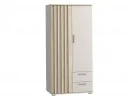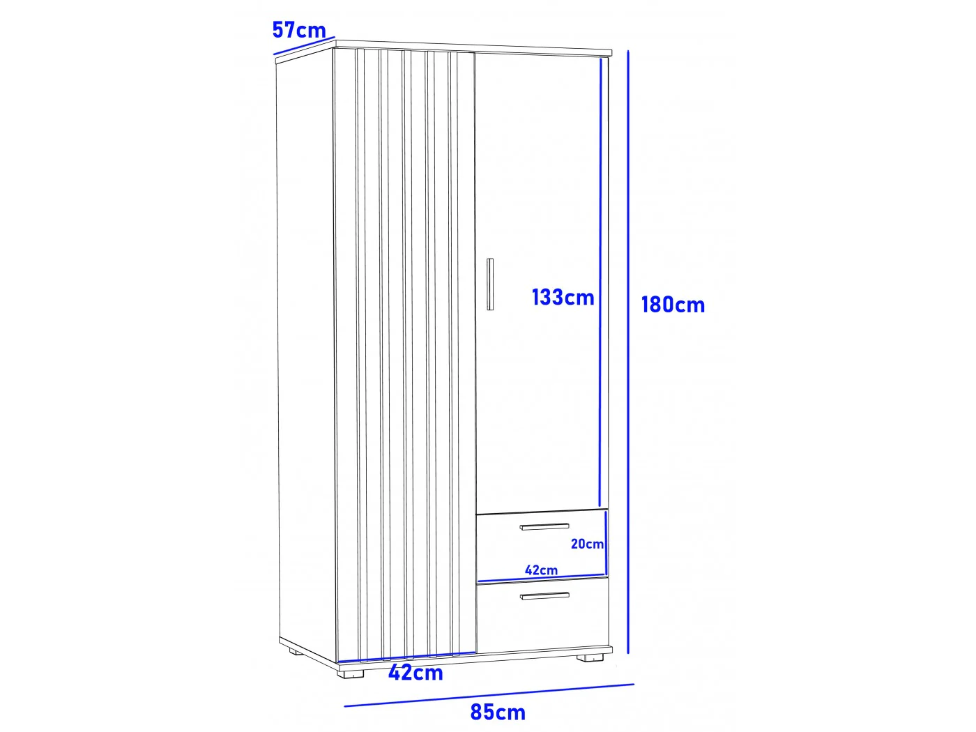 Drążek na wieszaki, półki na odzież, 2 głębokie szuflady (40 cm), przemyślany układ wnętrza zapewniający porządek, lamele, płaskie uchwyty i eleganckie stopki.