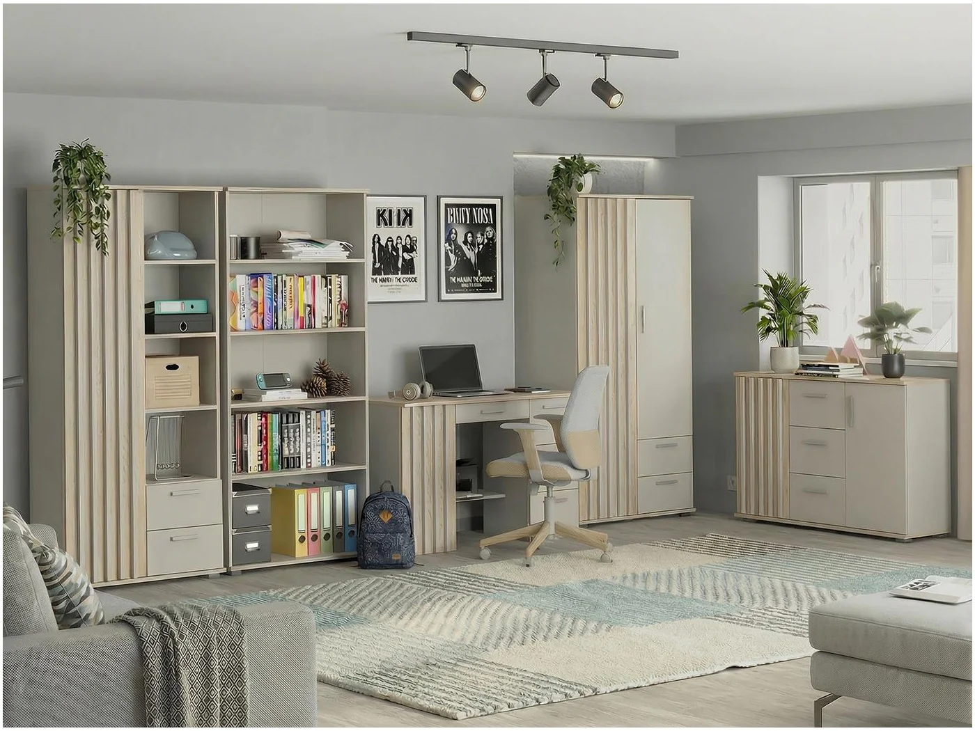 Stwórz spójny i nowoczesny pokój młodzieżowy dzięki zestawowi mebli, który łączy elegancki wygląd z przemyślaną funkcjonalnością. Pionowe lamele na frontach dodają charakteru i nowoczesnego stylu, a każdy element został zaprojektowany tak, aby zapewnić komfortową przestrzeń do nauki, przechowywania ubrań, książek i akcesoriów.