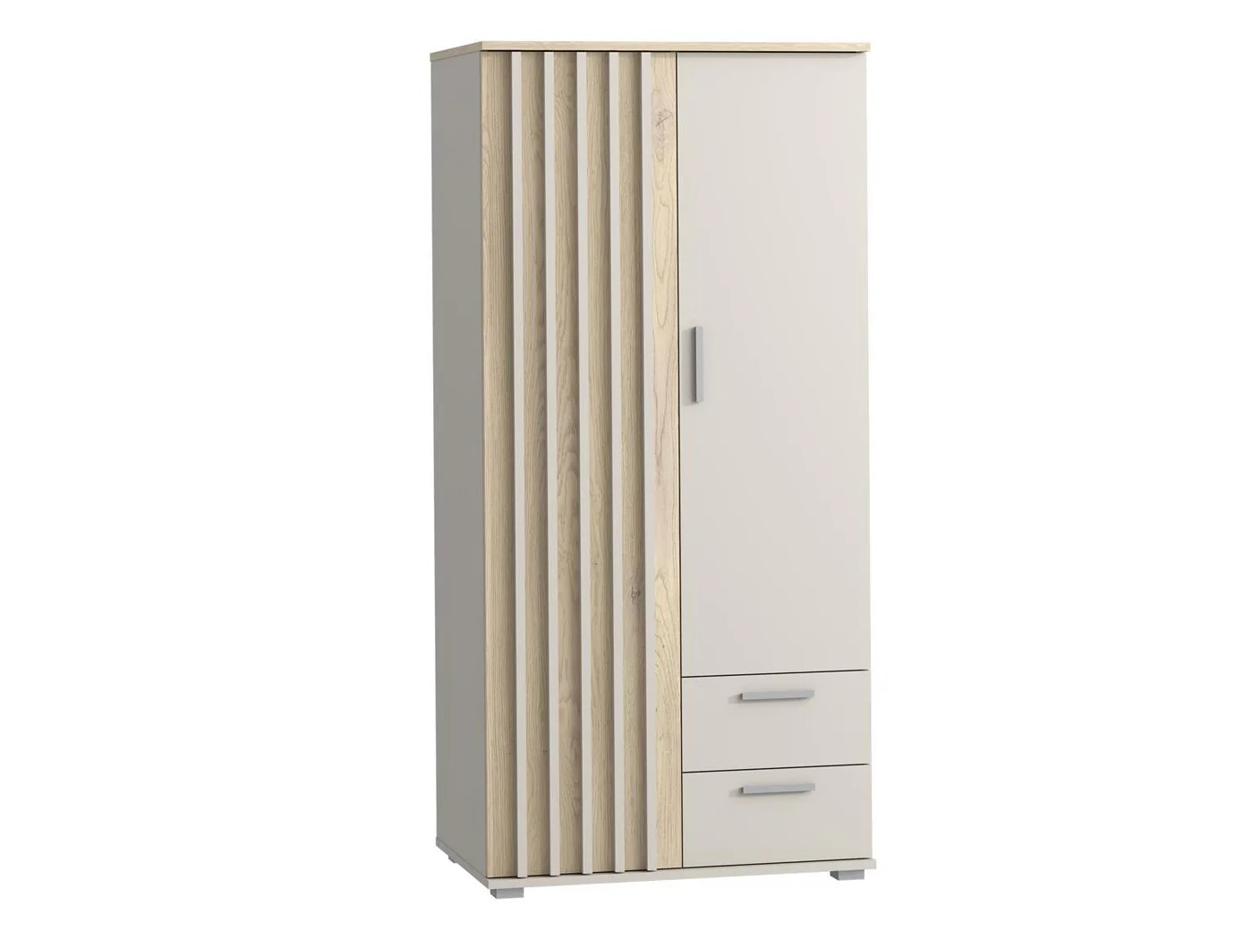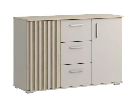2 drzwiczki i 3 pojemne szuflady, ozdobne lamele, nowoczesne uchwyty, stabilne stopki, prowadnice rolkowe z blokadą, idealna na odzież, podręczniki i akcesoria.
