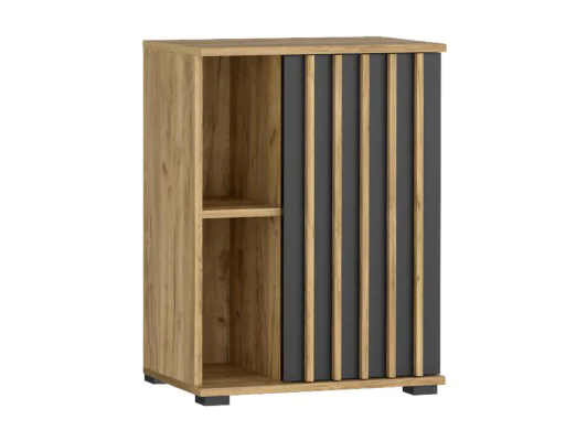 Ta szafka stojąca jest doskonałym uzupełnieniem szafki RTV i szafki wiszącej. Zapewnia dodatkową przestrzeń do przechowywania i organizacji. Może służyć jako schowek na książki, magazyny, gry planszowe lub inne przedmioty, które chciałbyś mieć w zasięgu ręki. Jej solidna konstrukcja i zgodność stylowa z pozostałymi elementami zestawu sprawiają, że jest to funkcjonalne i atrakcyjne rozwiązanie. Drzwi szafki ozdobione są lamelami z płyty MDF o grubości 18x16 mm, ich smukła konstrukcja pozwala na dyskretny i estetyczny wygląd, jednocześnie zapewniając solidność i trwałość. Dzięki technologii niewidocznego montażu, połączenia między lamelami są niemalże niewidoczne, co nadaje im elegancki wygląd i sprawia, że są idealne dla tych, którzy cenią minimalizm i czystość w designie.
