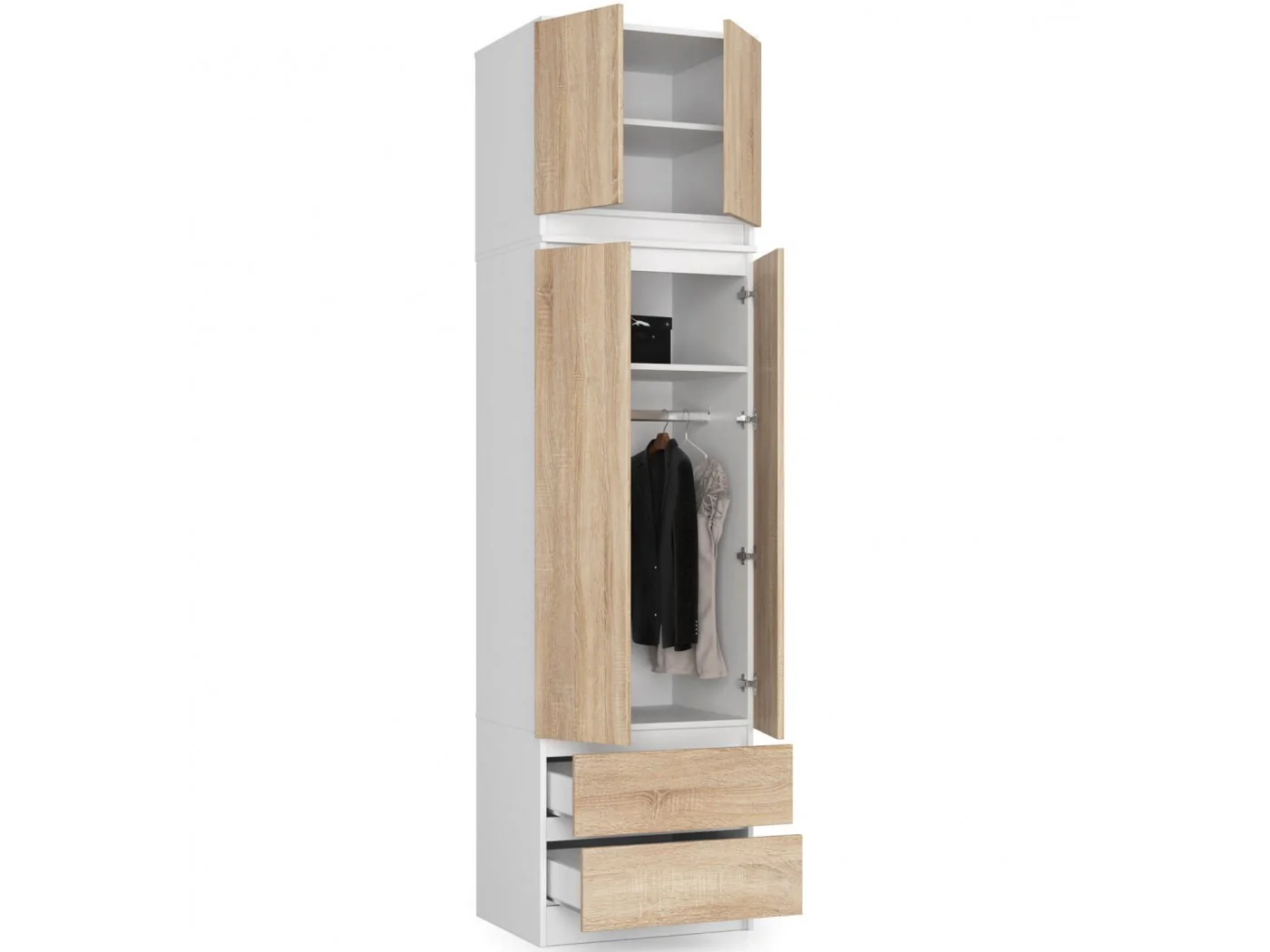 Biel to kolor ponadczasowy i na tyle uniwersalny, że świetnie łączy się z wszelkimi innymi barwami. Biała nadstawka na szafę z frontami dąb sonoma o szerokości 60 cm. jest propozycją skierowaną do osób, które chcą zapewnić sobie jeszcze więcej miejsca do przechowywania odzieży, obuwia, toreb, dokumentów czy innych artykułów w sypialni, przedpokoju, pokoju dziennym bądź biurze. Minimalistyczny design prezentowanego produktu w połączeniu z funkcjonalnością oraz solidnym wykonaniem sprawia, że nadstawka na szafę cieszy się dużym zainteresowaniem.