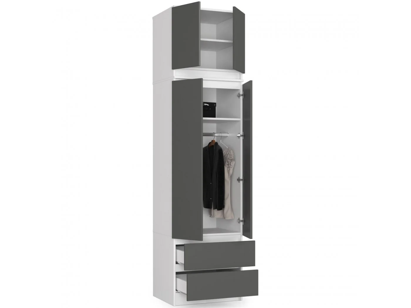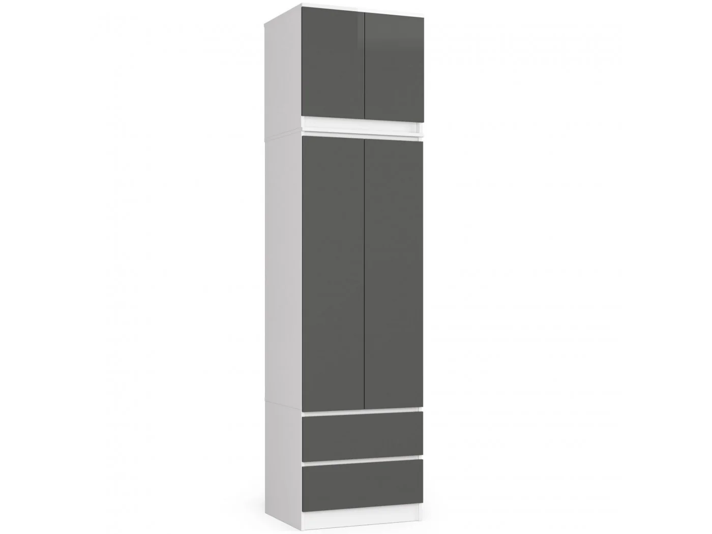 Biel to kolor ponadczasowy i na tyle uniwersalny, że świetnie łączy się z wszelkimi innymi barwami. Biała nadstawka na szafę z frontami grafit szary o szerokości 60 cm. jest propozycją skierowaną do osób, które chcą zapewnić sobie jeszcze więcej miejsca do przechowywania odzieży, obuwia, toreb, dokumentów czy innych artykułów w sypialni, przedpokoju, pokoju dziennym bądź biurze. Minimalistyczny design prezentowanego produktu w połączeniu z funkcjonalnością oraz solidnym wykonaniem sprawia, że nadstawka na szafę cieszy się dużym zainteresowaniem.