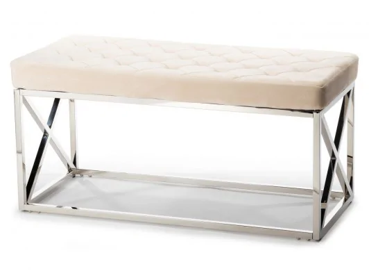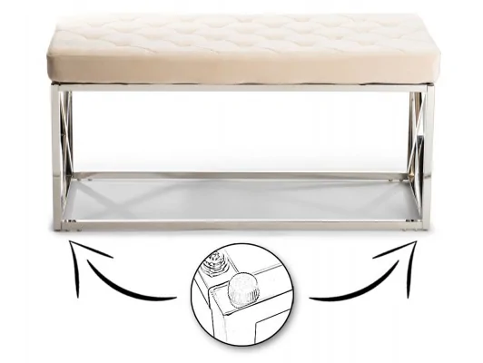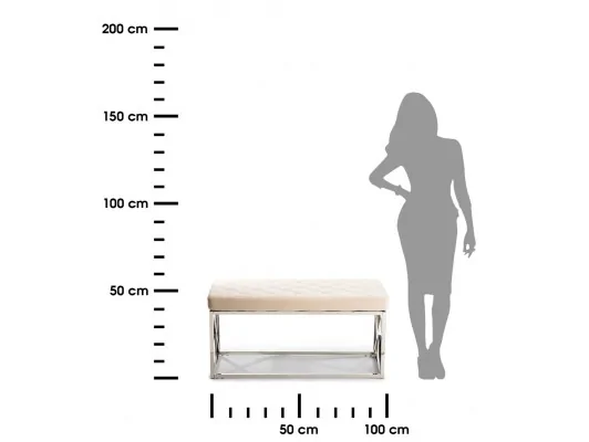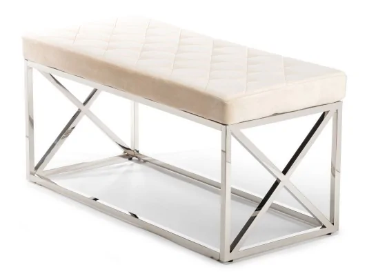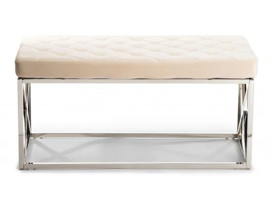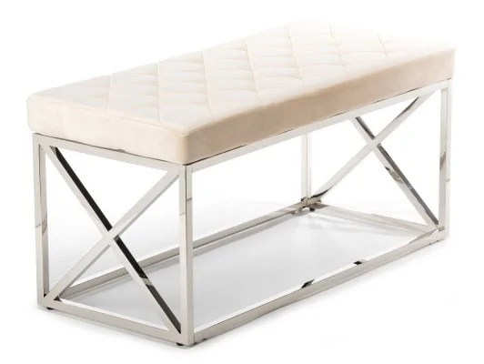 Stylowa pufa, na stalowej, srebrnej ramie z pikowanym obiciem w kolorze białym, o wymiarach 97x44x46 cm.