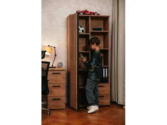 Nowoczesny regał w stylu loftowym – idealny do biura, salonu lub pokoju młodzieżowego. Wyposażony w otwarte półki, dwie pojemne szuflady i zamykaną szafkę z eleganckimi lamelami. Wykonany z trwałej płyty laminowanej w kolorze dąb craft i czarnym. Wysokość 180 cm. Świetnie łączy estetykę i funkcjonalność.