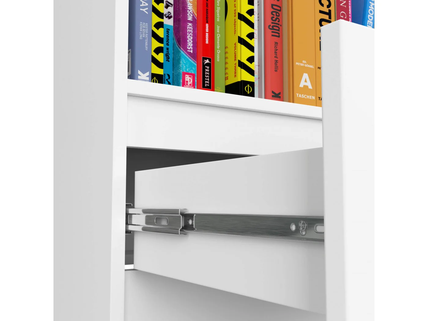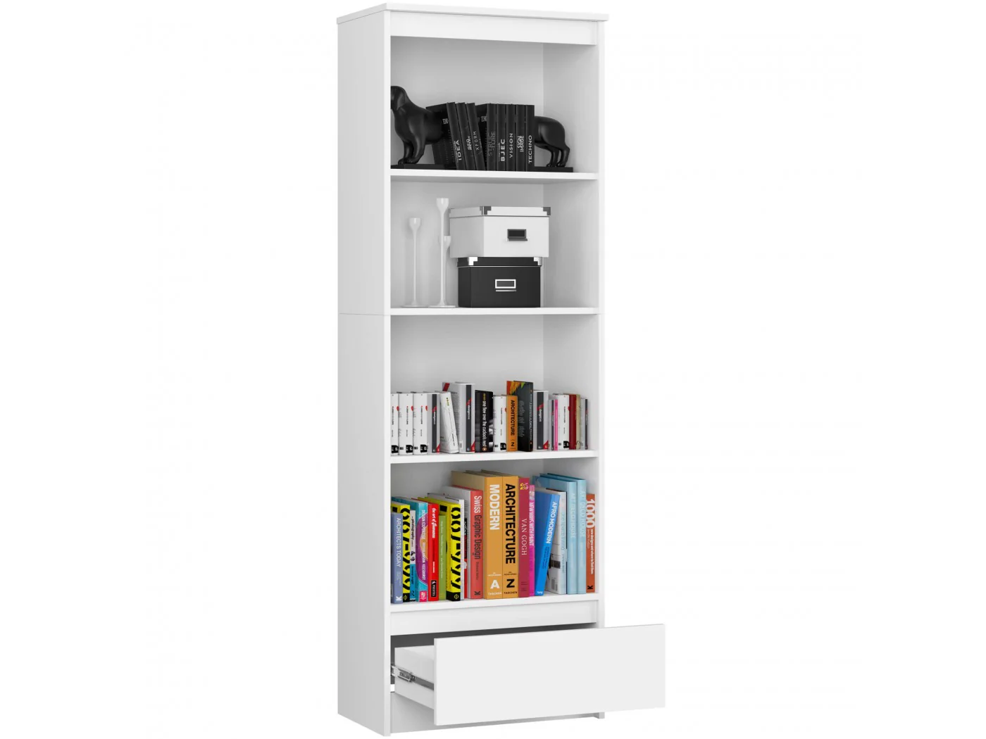 Istotnym wyróżnikiem regału jest jego funkcjonalność. Wyposażony w 4 duże półki i szufladę stwarza szerokie możliwości przechowywania, a tym samym zapewnia utrzymanie porządku i ładu. Doskonale będą na nim wyglądały książki, pudełka z pamiątkami z podróży czy biurowe segregatory. Szuflada wygodnie pomieści domowe lub firmowe gadżety. Regał jest meblem efektownym i praktycznym, i wyróżnia się najwyższymi standardami jakości.