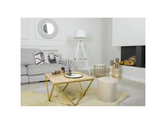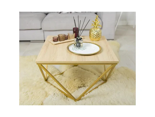 Konstrukcja lakierowana na złoto, blat wykonany z płyty MDF w kolorze jasny dąb, wysokość 39 cm, wymiary blatu 62x62 cm