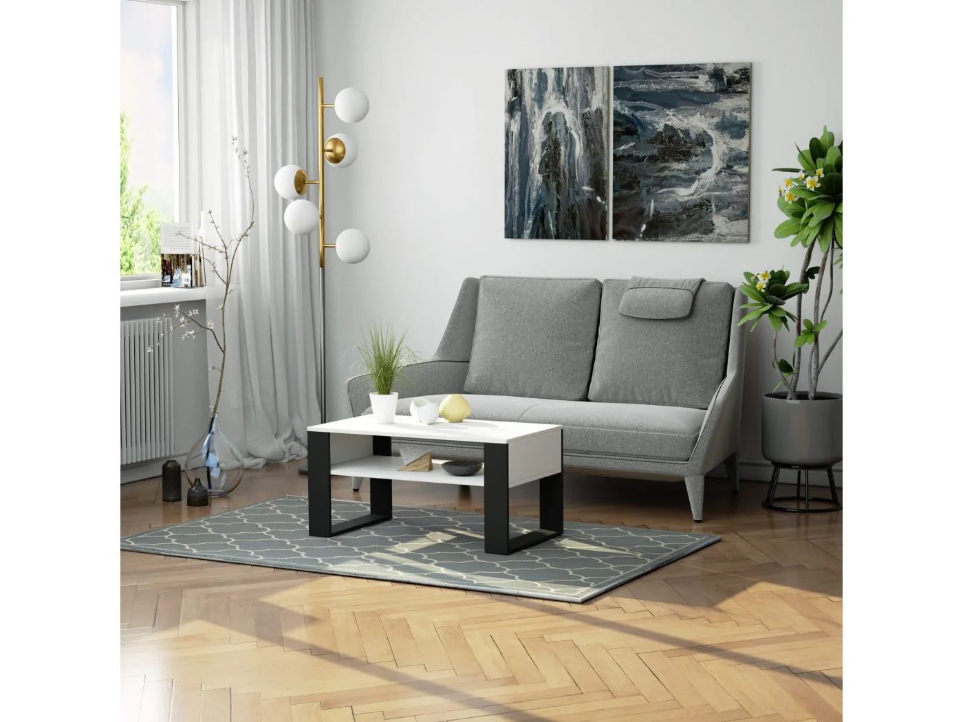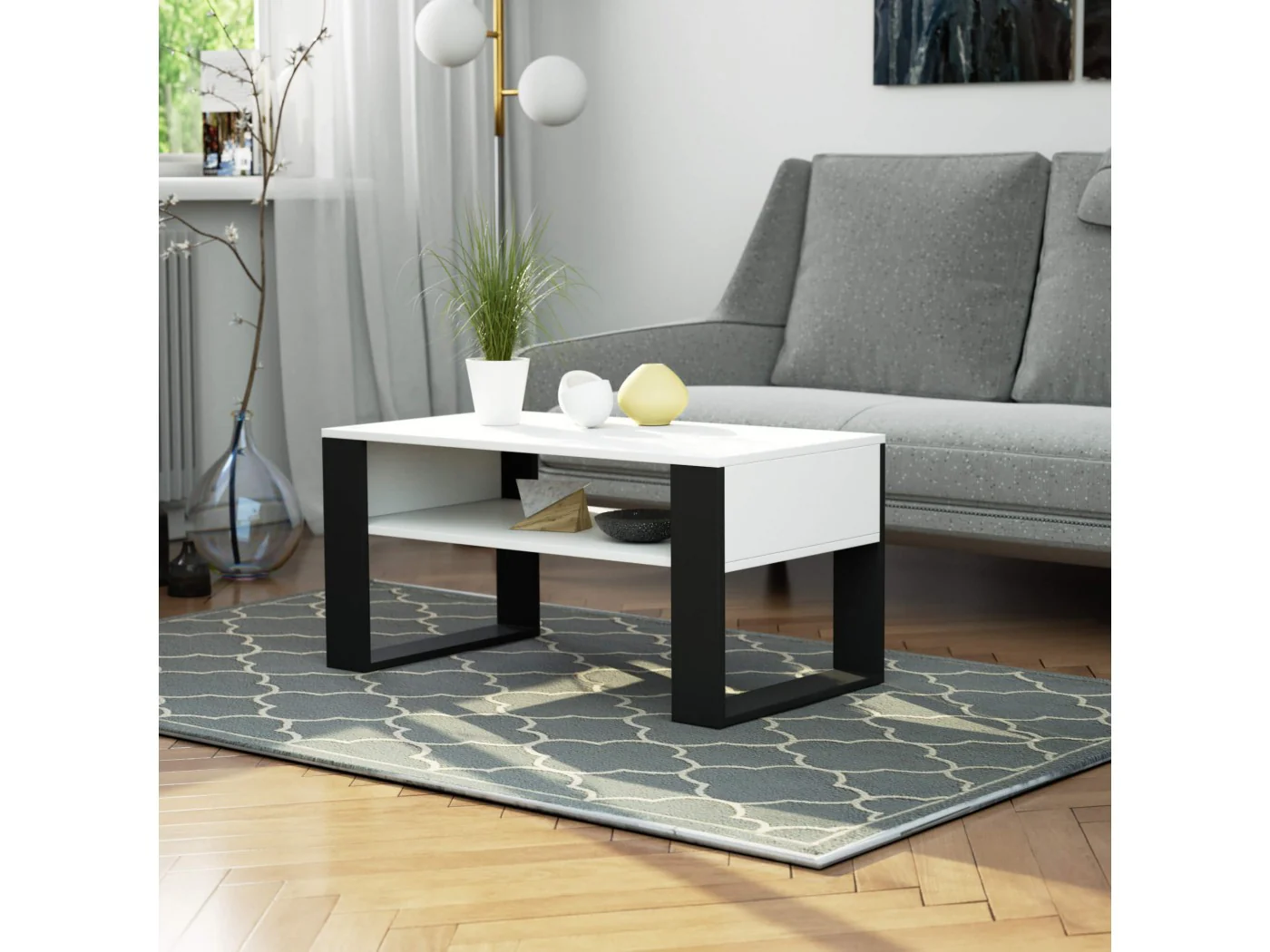 Ława kawowa Domi biała z czarnymi nogami to połączenie atrakcyjnego i estetycznego wyglądu z funkcjonalnością i uniwersalnością zastosowania. Dzięki ciepłej białej kolorystyce ława doskonale wkomponuje się we wnętrze nowoczesne i tradycyjne, jednocześnie wizualnie powiększając i rozjaśniając pomieszczenie. Niewielki rozmiar mebla sprawia, że ława doskonale spełni swoje zadanie również w małym pokoju w bloku. Ława jest meblem o wszechstronnym przeznaczeniu. Może być wykorzystywana nie tylko do picia kawy, herbaty lub zimnych napojów, przyjmowania gości czy codziennego relaksu. Stolik z funkcjonalnym blatem nadaje się także do pracy z laptopem, zaś umieszczona na dole mebla szeroka półka umożliwia położenie na niej akcesoriów komputerowych i materiałów do pracy. Biała ława kawowa Domi z czarnymi nogami wykonana została z odpornej na ścieranie i wodoodpornej płyty laminowanej, dzięki czemu blat mebla może z powodzeniem być czyszczony również na mokro. Krawędzie ławy zostały wykończone wytrzymałymi obrzeżami ABS, co dodatkowo zwiększa odporność mebla na uszkodzenia.
