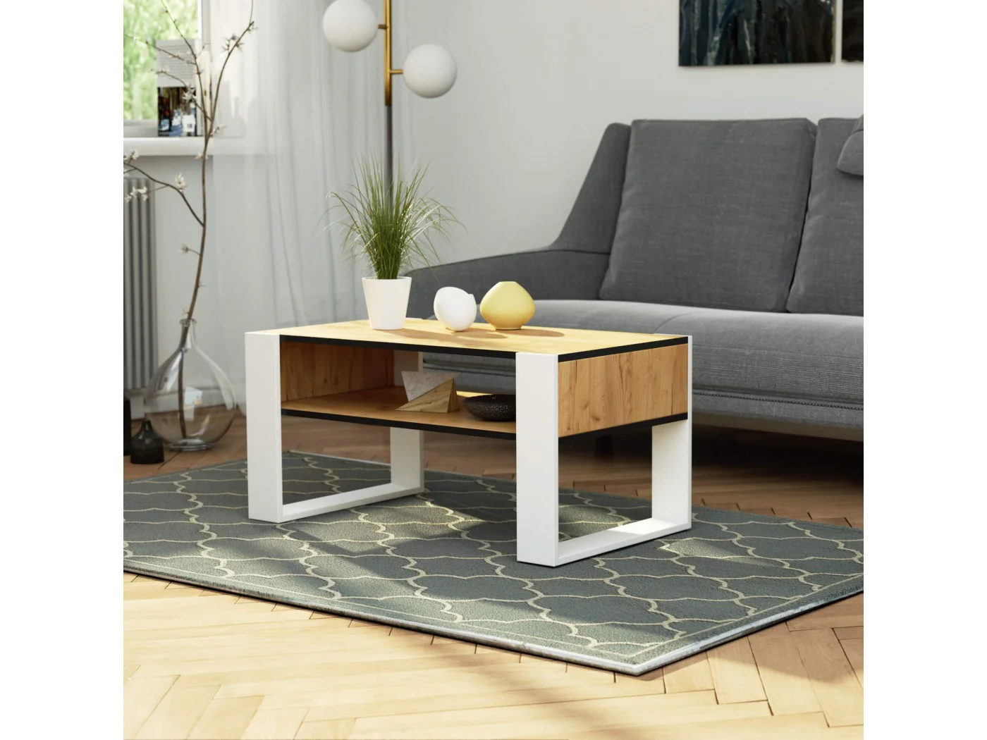 Ława kawowa Domi dąb craft z białymi nogami to połączenie atrakcyjnego i estetycznego wyglądu z funkcjonalnością i uniwersalnością zastosowania. Dzięki ciepłej białej kolorystyce ława doskonale wkomponuje się we wnętrze nowoczesne i tradycyjne, jednocześnie wizualnie powiększając i rozjaśniając pomieszczenie. Niewielki rozmiar mebla sprawia, że ława doskonale spełni swoje zadanie również w małym pokoju w bloku. Ława jest meblem o wszechstronnym przeznaczeniu. Może być wykorzystywana nie tylko do picia kawy, herbaty lub zimnych napojów, przyjmowania gości czy codziennego relaksu. Stolik z funkcjonalnym blatem nadaje się także do pracy z laptopem, zaś umieszczona na dole mebla szeroka półka umożliwia położenie na niej akcesoriów komputerowych i materiałów do pracy. Ława kawowa Domi dąb craft z białymi nogami wykonana została z odpornej na ścieranie i wodoodpornej płyty laminowanej, dzięki czemu blat mebla może z powodzeniem być czyszczony również na mokro. Krawędzie ławy zostały wykończone wytrzymałymi obrzeżami ABS, co dodatkowo zwiększa odporność mebla na uszkodzenia.
