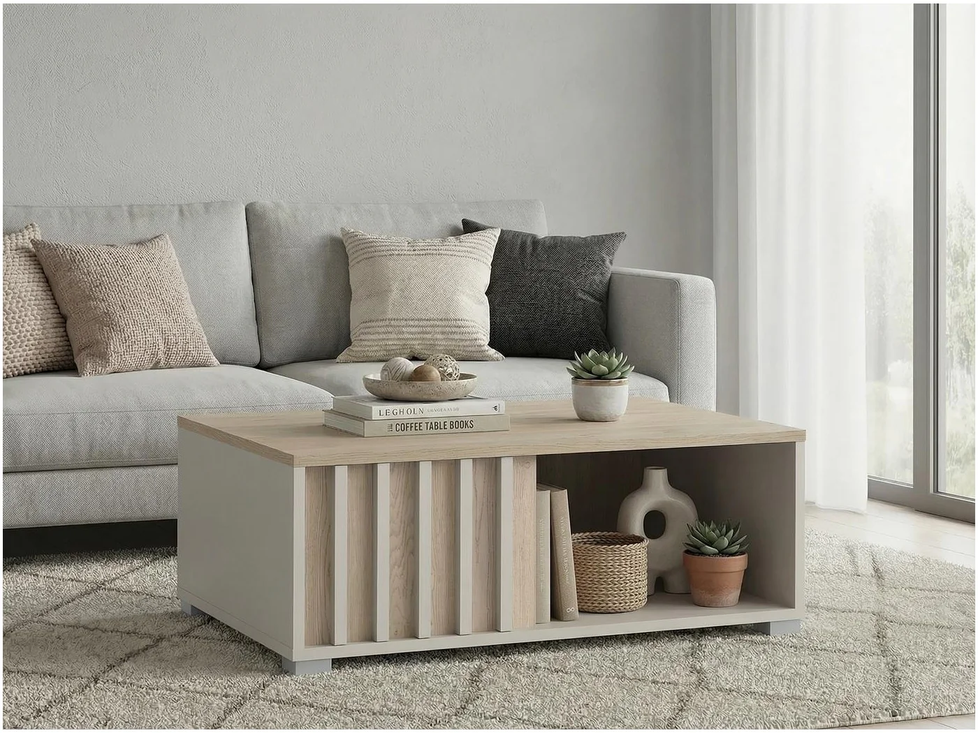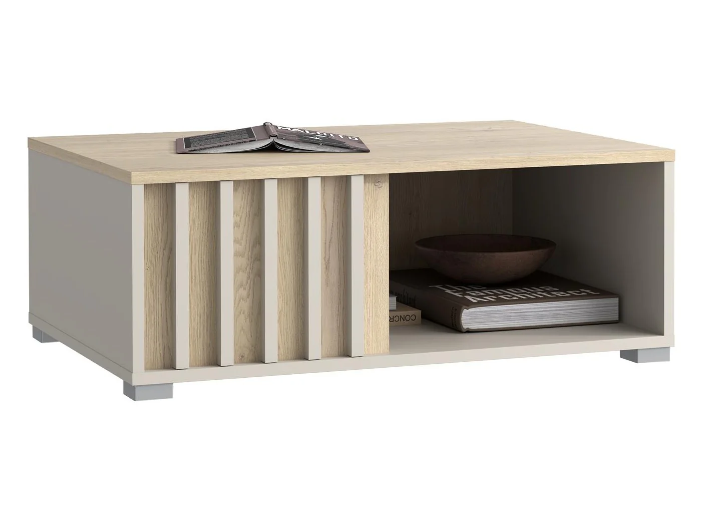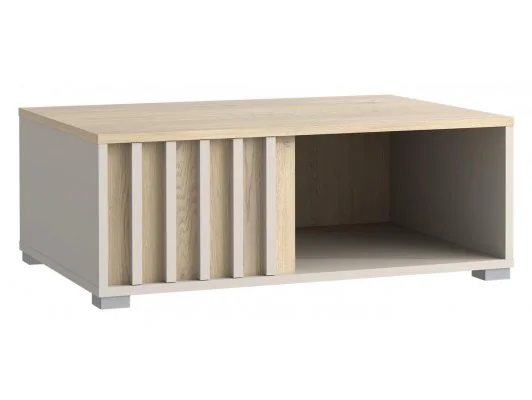 Nowoczesny stolik kawowy Montana 90 z lamelami – kaszmir + dąb cremona, praktyczna półka i stylowy akcent do salonu lub pokoju dziennego.