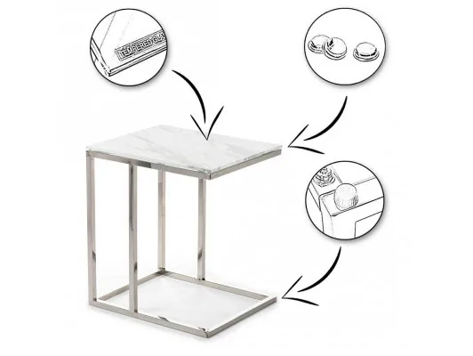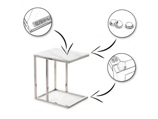 Podstawa stoliczka kawowego Lurus została wykonana ze stali nierdzewnej, polerowanej na wysoki połysk w kolorze srebrnym.