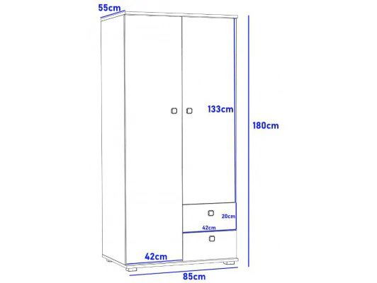 Wewnątrz znajdziesz pojemne półki, drążek na ubrania wiszące oraz 2 głębokie szuflady idealne na bieliznę lub drobiazgi. Szafa wykonana jest z trwałej płyty laminowanej 18 mm, zabezpieczonej obrzeżem ABS – co gwarantuje odporność na zarysowania i codzienne użytkowanie.