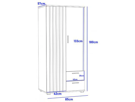 Stylowa i funkcjonalna szafa dwudrzwiowa z kolekcji Montana to doskonały wybór do sypialni, garderoby, przedpokoju czy pokoju młodzieżowego. Mebel łączy nowoczesny styl LOFT z praktycznym układem wnętrza – oferuje drążek na wieszaki, liczne półki oraz dwie głębokie szuflady na dodatki i bieliznę.