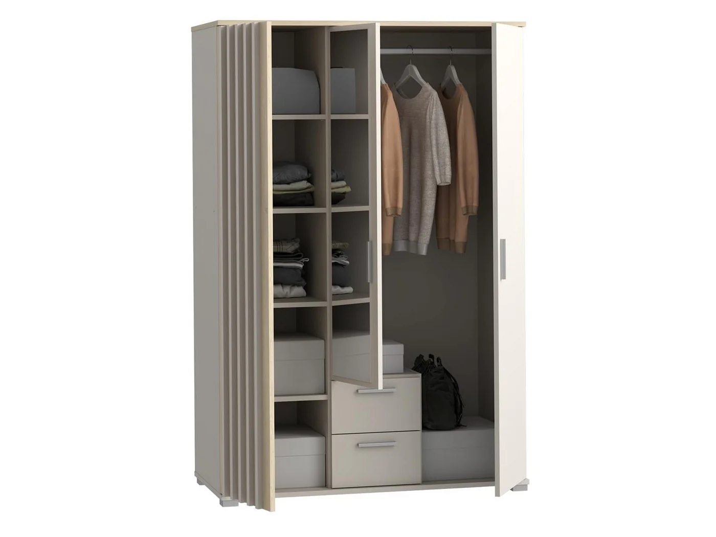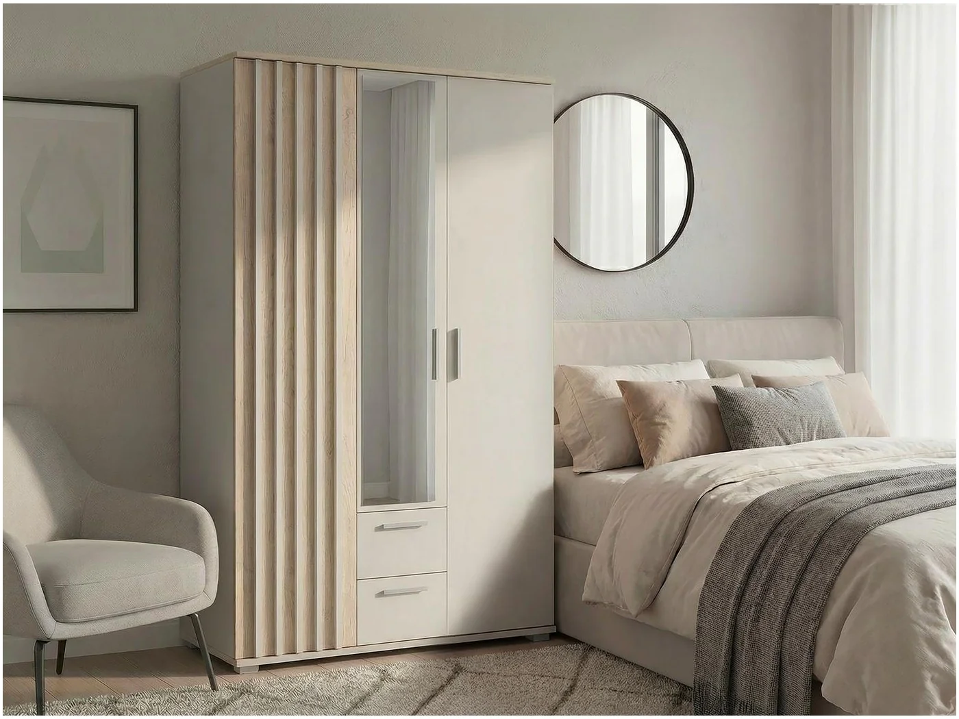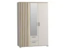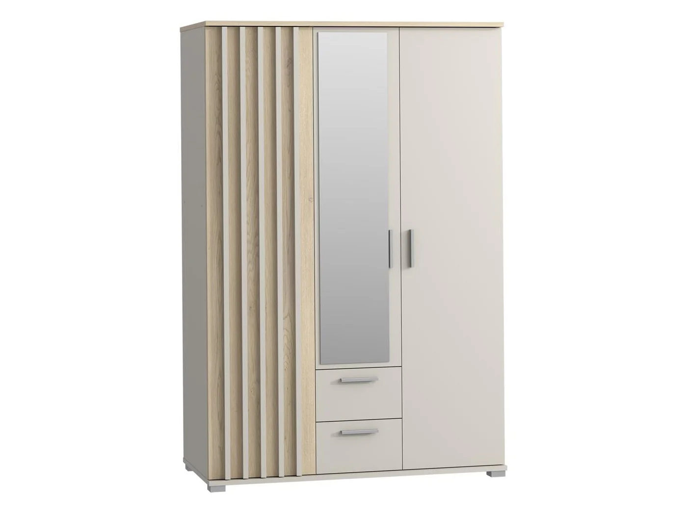 Stylowa i funkcjonalna szafa 120 cm z lamelami i lustrem w kolorze kaszmir + dąb cremona. Posiada półki, drążek na ubrania i 2 pojemne szuflady, dzięki czemu pomieści całą garderobę. Nowoczesny design, lustro optycznie powiększa wnętrze, a solidne wykonanie z płyty laminowanej 18 mm zapewnia trwałość i stabilność. Idealna do sypialni, garderoby, przedpokoju lub pokoju młodzieżowego.