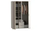 Wnętrze zostało zaprojektowane z myślą o wygodzie. Drążek na wieszaki umożliwia przechowywanie koszul, marynarek, sukienek czy płaszczy bez zagnieceń, a pojemne półki ułatwiają segregację złożonych ubrań, pudełek i akcesoriów. Dodatkowo dwie głębokie szuflady doskonale sprawdzą się na bieliznę, dodatki, dokumenty lub inne drobiazgi, które warto mieć zawsze pod ręką, ale poza widokiem.