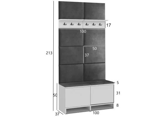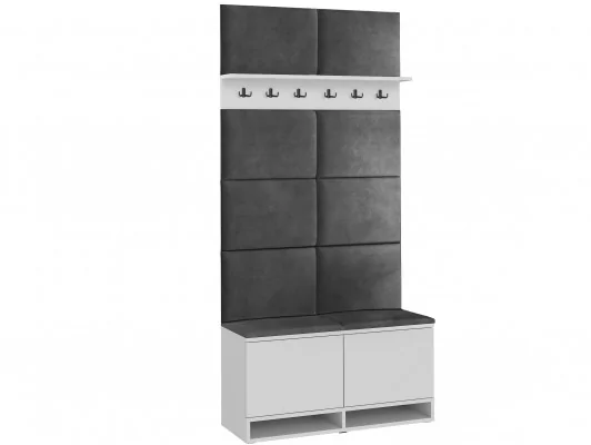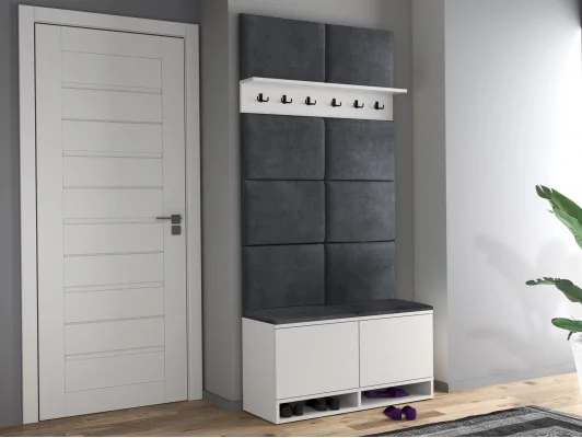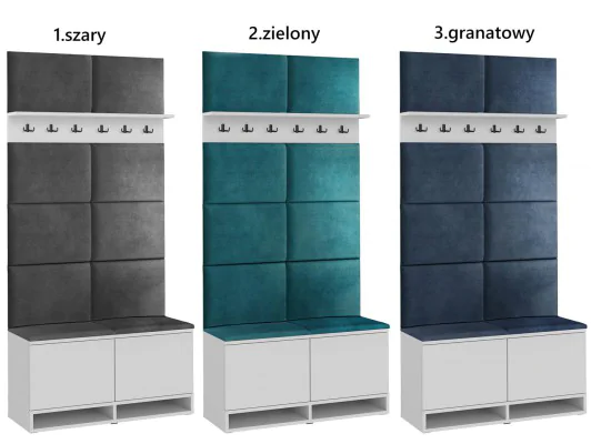 Nowoczesny komplet do przedpokoju dostępny w czterech wersjach kolorystycznych wraz z trzema kolorami siedziska i paneli tapicerowanych do wyboru
