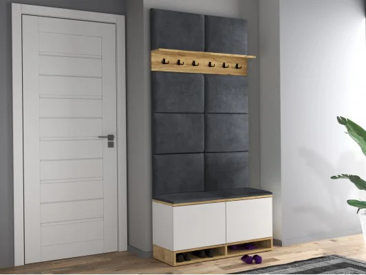 Nowoczesny komplet do przedpokoju dostępny w czterech wersjach kolorystycznych wraz z trzema kolorami siedziska i paneli tapicerowanych do wyboru