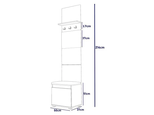 Nowoczesna szafka na buty z siedziskiem, wieszakiem i panelami Nevada 50 do przedpokoju dostępna w 3 kolorach: biały, sonoma, craft, oraz z trzema kolorami paneli: szary, granatowy, zieleń butelkowa.