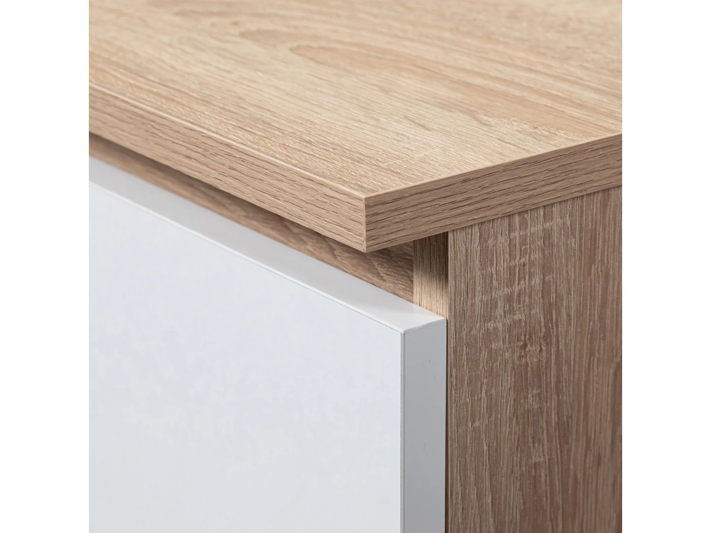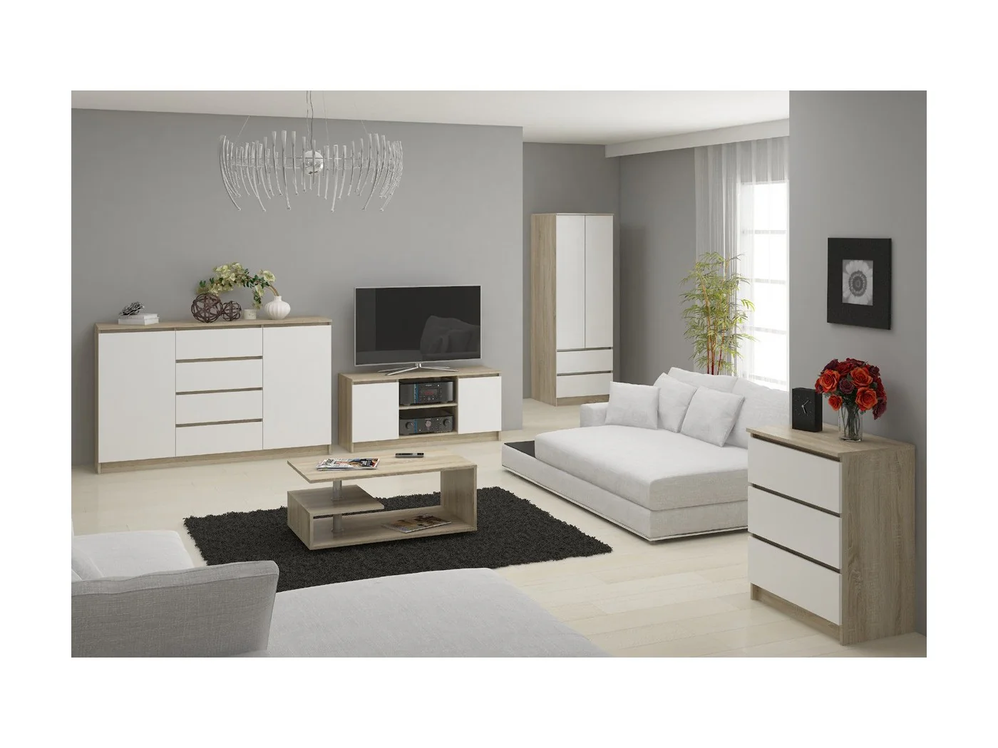 Szafka RTV to produkt wysokiej jakości, który doskonale łączy się z innymi meblami pochodzącymi z proponowanego przez nas asortymentu. Jest to mebel zaprojektowany w nowoczesnym stylu, będący połączeniem dwóch uniwersalnych oraz ponadczasowych kolorów, takich jak dąb sonoma oraz klasyczna biel. Komoda jest łatwa w utrzymaniu czystości, co również jest jej niewątpliwym atutem. Ponadto dostępna jest w bardzo atrakcyjnej cenie.