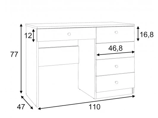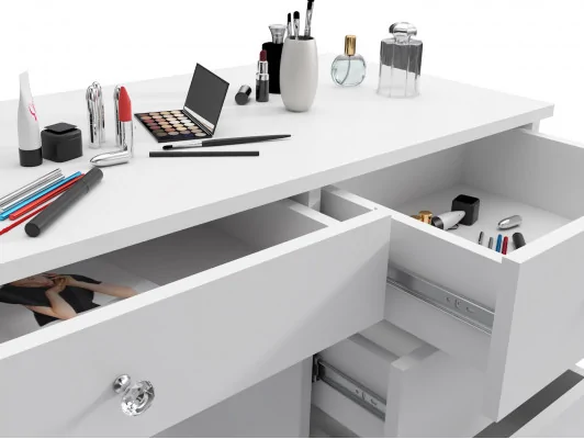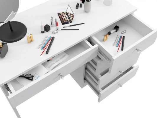 Toaletka Cristal posiada 5 pojemnych szuflad w, których zmieści się wiele kosmetyków, biżuterii i innych akcesoriów.