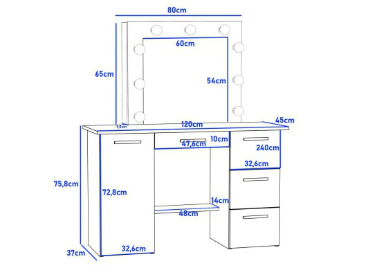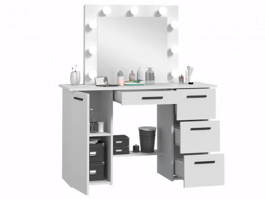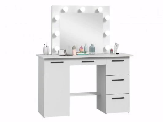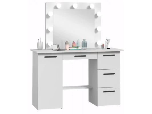 Toaletka z lustrem oświetlonym przez 9 żarówek to idealne miejsce do codziennej pielęgnacji i przygotowań. Wyposażona w 4 szuflady, zamykaną szafkę oraz dodatkową półkę między słupkami, oferuje obfite miejsce na przechowywanie kosmetyków i akcesoriów. Dzięki harmonijnemu połączeniu funkcjonalności z elegancją, ta toaletka stanie się centralnym punktem Twojej przestrzeni do makijażu i pielęgnacji.