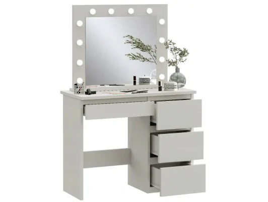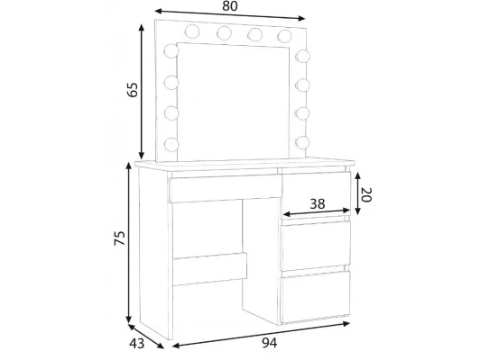 Kompaktowy blat o szerokości 94 cm zapewnia wystarczająco dużo miejsca na kosmetyki, akcesoria i codzienne niezbędniki, a 4 pojemne szuflady pozwalają na wygodne przechowywanie i utrzymanie porządku. Toaletka wyróżnia się nie tylko funkcjonalnością, ale i starannym wykonaniem – solidna płyta laminowana 18 mm oraz obrzeża ABS gwarantują trwałość na lata.