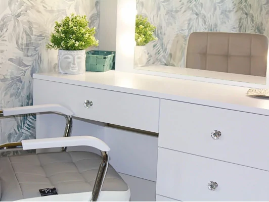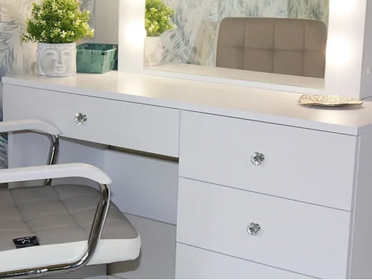 Biała toaletka Cristal sprawdzi się również w salonie kosmetycznym jako podstawowe narzędzie pracy profesjonalnej wizażystki.
