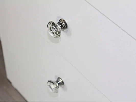 Na każdej szufladzie stanowiska do makijażu Cristal został zamontowany designerski uchwyt diamentowy w stylu glamour.