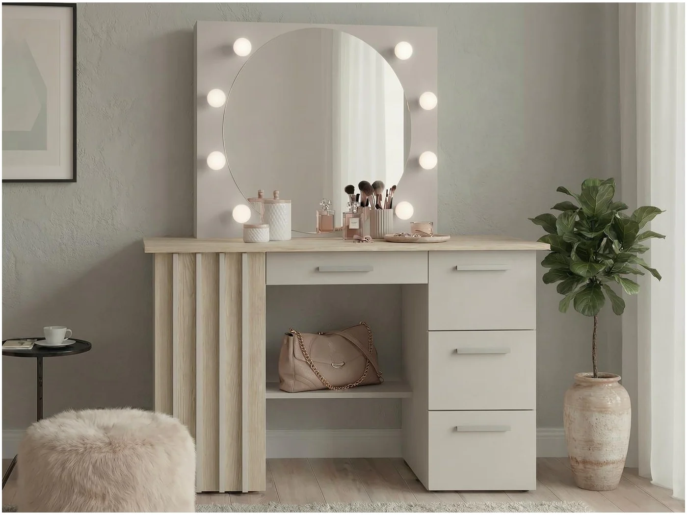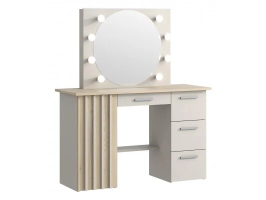Elegancka i funkcjonalna toaletka Montana z okrągłym lustrem LED 8 punktów – nowoczesny design w kaszmirze z lamelami, pojemne szuflady i idealne oświetlenie do makijażu i pielęgnacji.