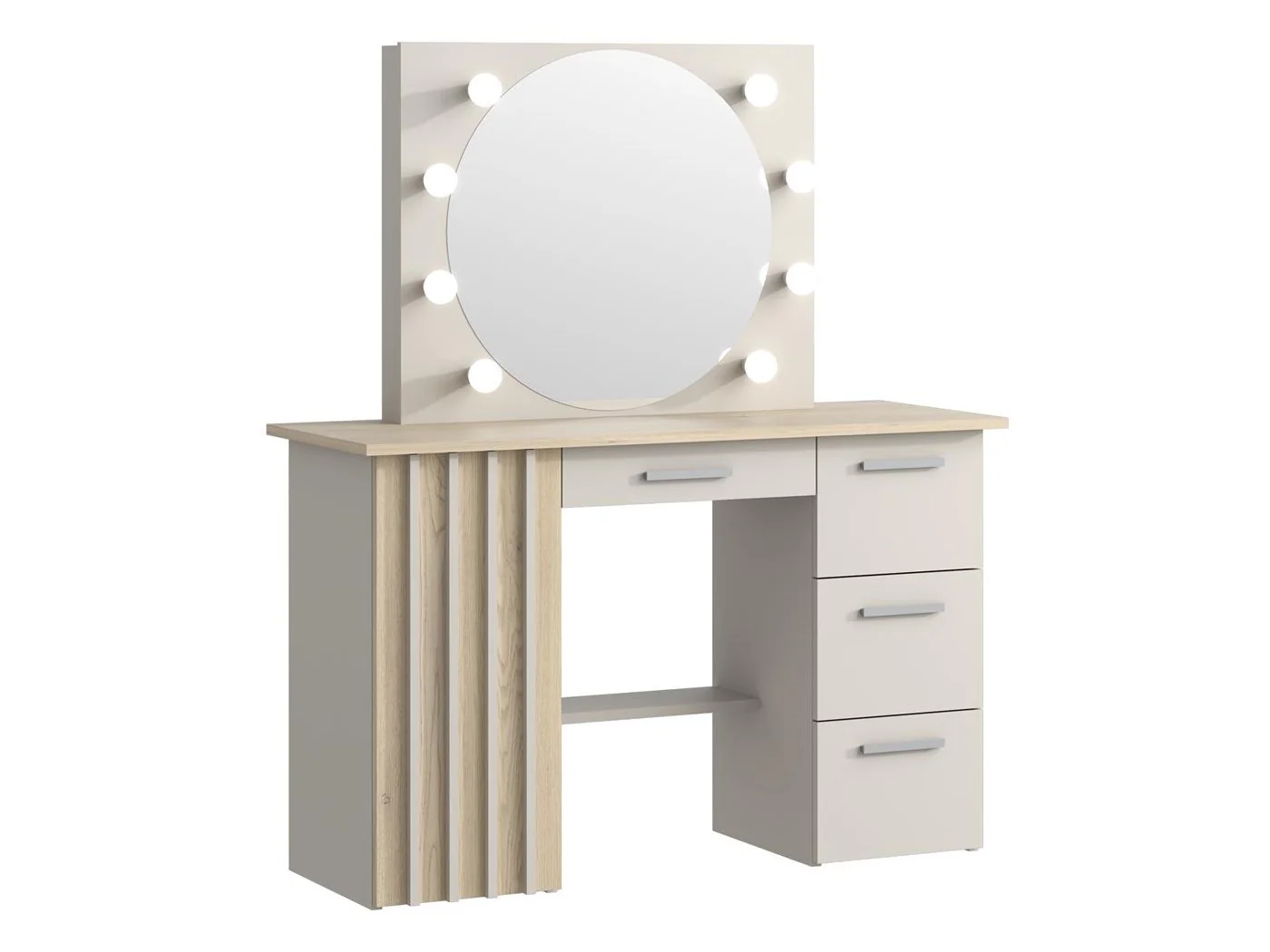 Nowoczesne lamelowe fronty nadają toaletce elegancki i designerski charakter, a harmonijna forma okrągłego lustra w połączeniu z wysokiej jakości materiałami sprawia, że mebel idealnie komponuje się w różnych wnętrzach – zarówno nowoczesnych, loftowych, jak i klasycznych.