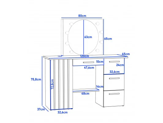 Wymiary toaletki i lustra zostały dobrane tak, aby zapewnić wygodę użytkowania i maksymalną funkcjonalność: stelaż 80 × 65 × 10 cm, tafla lustra 63 cm średnicy, blat biurka 120 × 45 × 76 cm, a szuflady o głębokości 35 cm pozwalają pomieścić wszystkie niezbędne kosmetyki i akcesoria.
