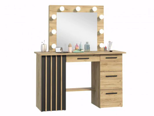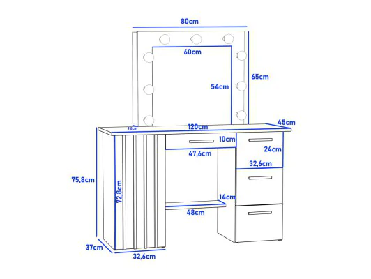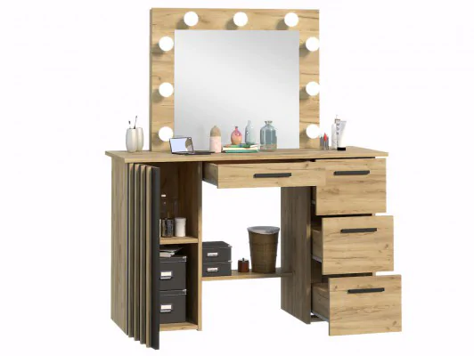 Toaletka z prostokątnym lustrem oświetlonym przez 9 żarówek to idealne miejsce do codziennej pielęgnacji i przygotowań. Wyposażona w 4 szuflady, zamykaną szafkę oraz dodatkową półkę między słupkami, oferuje obfite miejsce na przechowywanie kosmetyków i akcesoriów. Dzięki harmonijnemu połączeniu funkcjonalności z elegancją, ta toaletka stanie się centralnym punktem Twojej przestrzeni do makijażu i pielęgnacji.