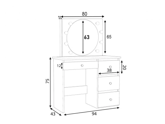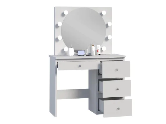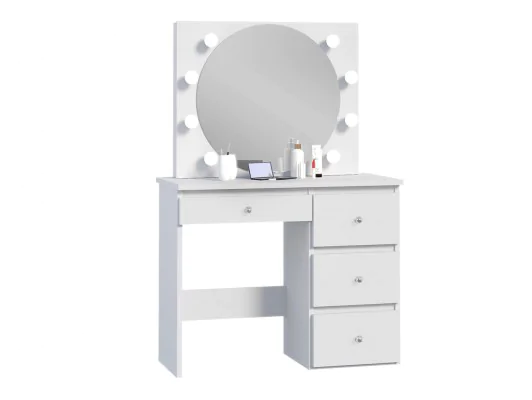 Toaletka z okrągłym lustrem oświetlonym przez 8 żarówek LED, tworzących niezwykle przyjemne stanowisko do codziennego makijażu i pielęgnacji skóry. Jej elegancki design uzupełniony jest uchwytami w kształcie diamentów, dodających subtelnego i luksusowego akcentu. Idealna zarówno do użytku osobistego, jak i dekoracyjnego, ta toaletka stanie się nieodłącznym elementem wnętrza, podkreślając styl i elegancję pomieszczenia.