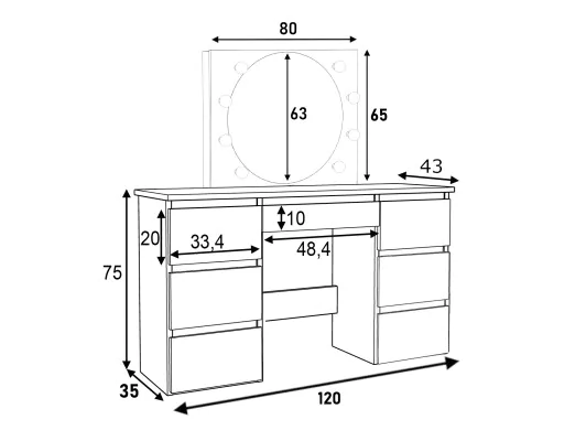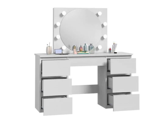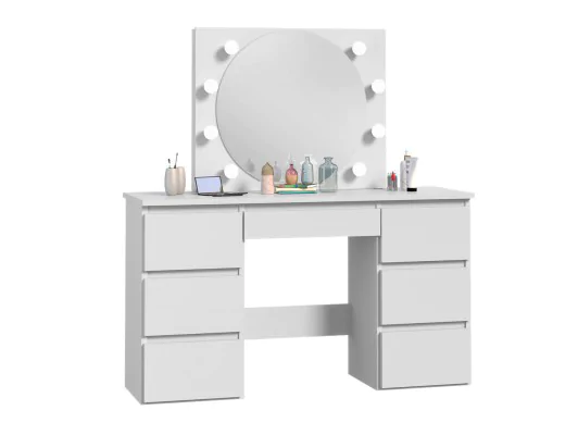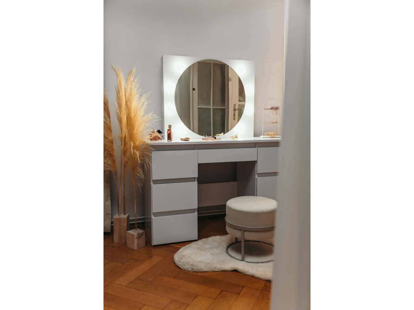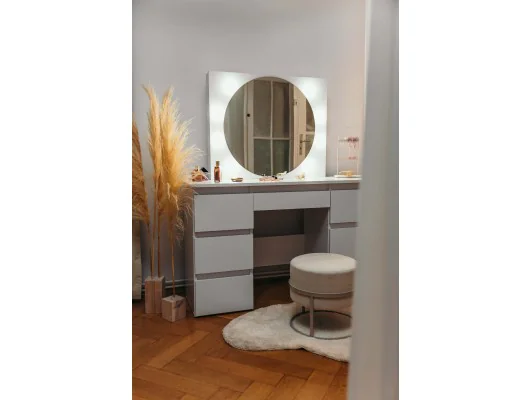 Toaletka z okrągłym lustrem oświetlonym przez 8 żarówek to idealne miejsce do codziennej pielęgnacji i przygotowań. Wyposażona w 7 szuflad, oferuje obfite miejsce na przechowywanie kosmetyków i akcesoriów. Dzięki harmonijnemu połączeniu funkcjonalności z elegancją, ta toaletka stanie się centralnym punktem Twojej przestrzeni do makijażu i pielęgnacji.