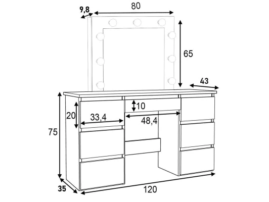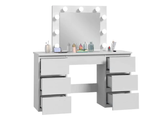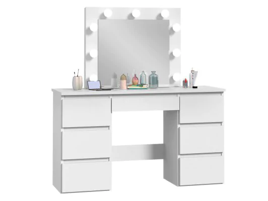 Toaletka z lustrem oświetlonym przez 9 żarówek to idealne miejsce do codziennej pielęgnacji i przygotowań. Wyposażona w 7 szuflad, oferuje obfite miejsce na przechowywanie kosmetyków i akcesoriów. Dzięki harmonijnemu połączeniu funkcjonalności z elegancją, ta toaletka stanie się centralnym punktem Twojej przestrzeni do makijażu i pielęgnacji.