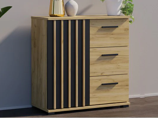 Komoda Montana 120 to większa wersja mebla, wyposażona w dwoje drzwi i trzy szuflady. Ta pojemna komoda zapewnia jeszcze więcej przestrzeni do przechowywania. Doskonale sprawdzi się jako schowek na ubrania, pościel, naczynia czy inne potrzebne przedmioty. Jej solidna konstrukcja i stylowy wygląd dodadzą elegancji Twojemu wnętrzu. Lewe drzwi szafki ozdobione są lamelami z płyty MDF o grubości 18x16 mm, ich smukła konstrukcja pozwala na dyskretny i estetyczny wygląd, jednocześnie zapewniając solidność i trwałość. Dzięki technologii niewidocznego montażu, połączenia między lamelami są niemalże niewidoczne, co nadaje im elegancki wygląd i sprawia, że są idealne dla tych, którzy cenią minimalizm i czystość w designie.