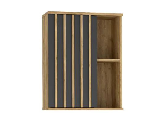 Ta elegancka szafka wisząca z pewnością przyciągnie uwagę swoim unikalnym stylem. Wyposażona w drzwi, zapewnia prywatność i ukrycie przechowywanych przedmiotów. Dodatkową zaletą jest boczna półka, która pozwala na wyeksponowanie dekoracji, zdjęć czy ulubionych ozdób. Drzwi szafki ozdobione są lamelami z płyty MDF o grubości 18x16 mm, ich smukła konstrukcja pozwala na dyskretny i estetyczny wygląd, jednocześnie zapewniając solidność i trwałość. Dzięki technologii niewidocznego montażu, połączenia między lamelami są niemalże niewidoczne, co nadaje im elegancki wygląd i sprawia, że są idealne dla tych, którzy cenią minimalizm i czystość w designie.