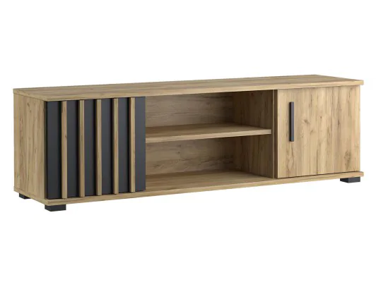 Szafka RTV z dwoma drzwiami i półką w środku to praktyczne rozwiązanie dla przechowywania sprzętu multimedialnego i dodatkowych akcesoriów. Możesz umieścić na niej telewizor, konsolę, odtwarzacz DVD czy dekoder. Dodatkowa półka w środku pozwoli na uporządkowanie kabli i dodatkowych urządzeń. Lewe drzwi szafki ozdobione są lamelami z płyty MDF o grubości 18x16 mm, ich smukła konstrukcja pozwala na dyskretny i estetyczny wygląd, jednocześnie zapewniając solidność i trwałość. Dzięki technologii niewidocznego montażu, połączenia między lamelami są niemalże niewidoczne, co nadaje im elegancki wygląd i sprawia, że są idealne dla tych, którzy cenią minimalizm i czystość w designie.