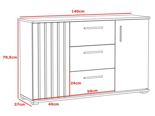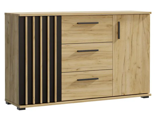 Komoda Montana 140, wyposażona w dwoje drzwi i trzy szuflady. Ta pojemna komoda zapewnia jeszcze więcej przestrzeni do przechowywania. Doskonale sprawdzi się jako schowek na ubrania, pościel, naczynia czy inne potrzebne przedmioty. Jej solidna konstrukcja i stylowy wygląd dodadzą elegancji Twojemu wnętrzu. Lewe drzwi szafki ozdobione są lamelami z płyty MDF o grubości 18x16 mm, ich smukła konstrukcja pozwala na dyskretny i estetyczny wygląd, jednocześnie zapewniając solidność i trwałość. Dzięki technologii niewidocznego montażu, połączenia między lamelami są niemalże niewidoczne, co nadaje im elegancki wygląd i sprawia, że są idealne dla tych, którzy cenią minimalizm i czystość w designie.