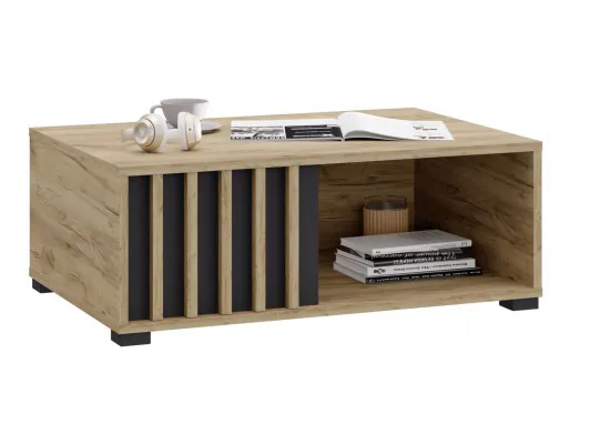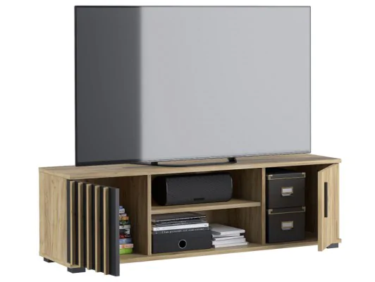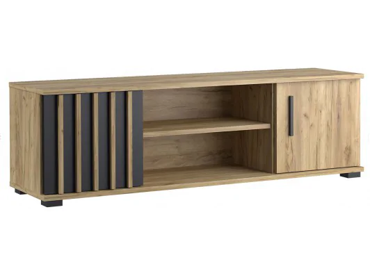 Meble do salonu MONTANA z lamelami – praktyczny zestaw: szafka RTV, ława, półka i komody, dąb craft + czarny