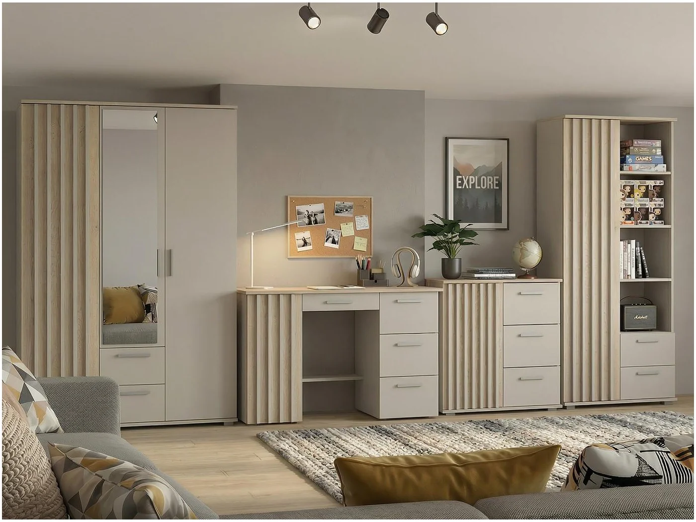 Nowoczesny 4-elementowy zestaw mebli do pokoju młodzieżowego łączy praktyczne przechowywanie, wygodną przestrzeń do nauki oraz modny akcent w postaci ozdobnych lameli. Idealny do mniejszych wnętrz, zapewnia maksimum funkcji w optymalnej formie.