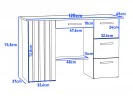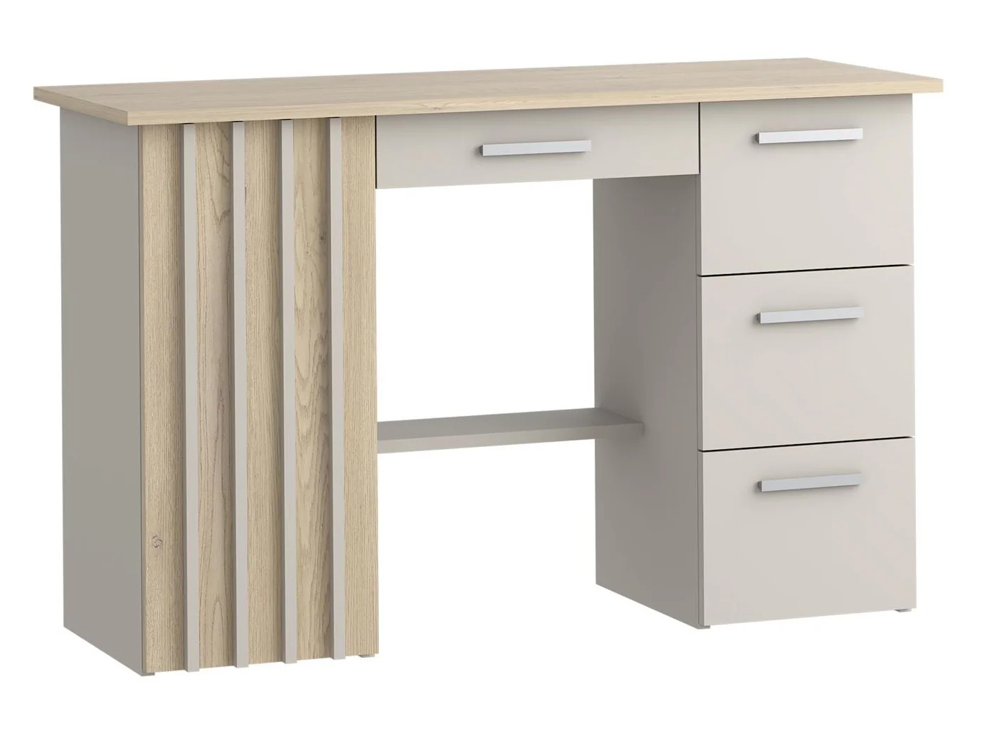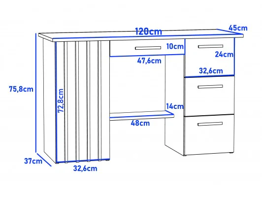Biurko 120 × 45 × 76 cm posiada jedną szafkę z wewnętrzną półką, cztery pojemne szuflady na przybory, zeszyty i drobiazgi oraz dodatkową półkę pod blatem. Stylowe lamele na froncie i płaskie uchwyty nadają nowoczesny wygląd. Szuflady wyposażone są w rolkowe prowadnice z blokadą