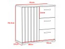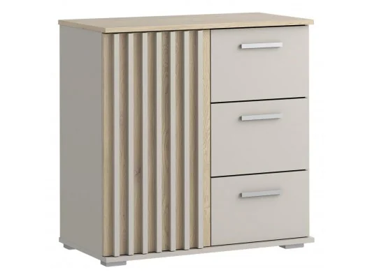 Komoda 80 1D3SZ 81 × 37 × 79,5 cm ma jedno drzwi i trzy pojemne szuflady. Nowoczesna forma z lamelami, płaskie uchwyty oraz solidne nóżki gwarantują stabilność. Prowadnice rolkowe z blokadą zapewniają komfortowe użytkowanie
