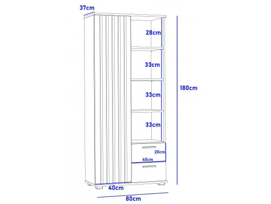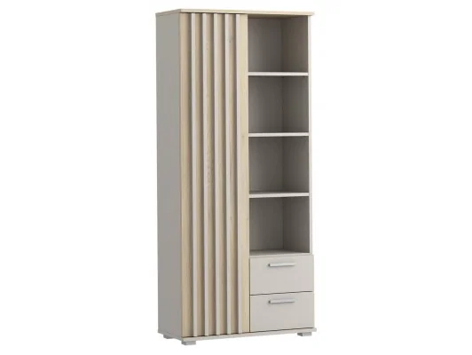Regał zamknięty R80 1D2SZ 180 × 80 × 37 cm łączy otwarte półki z zamykaną częścią. Dwie szuflady o głębokości 30 cm mieszczą książki, dokumenty i rzeczy osobiste. Prostota i stylowy design z lamelami podkreślają nowoczesny charakter wnętrza