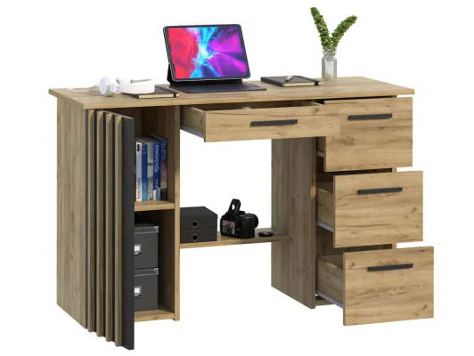 Zestaw mebli MONTANA to idealne rozwiązanie dla osób szukających funkcjonalnego, estetycznego i kompaktowego umeblowania pokoju młodzieżowego. Zestaw składa się z 4 elementów: biurka, komody, regału zamkniętego i szafy – wszystkie w spójnym stylu z nowoczesnymi lamelami.